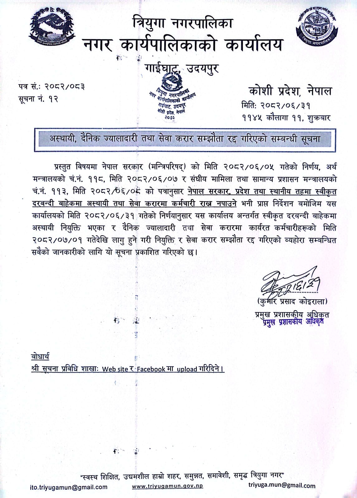अस्थायी करार तथा दैनिक ज्यालादारी सम्झौता रद्द गरिएको सूचना ।