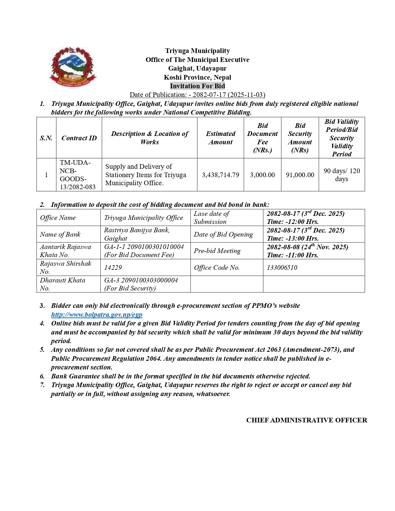 Supply and Delivery of Stationery Items for Triyuga Municipality Office.